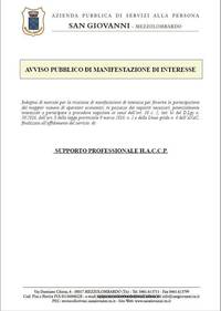 Si comunica che nella sezione del sito dell'A.P.S.P. "San Giovanni" di Mezzolombardo "Albo informatico/bandi di gara" sono stati pubblicati i documenti relativi alla manifestazione di interesse da parte di operatori economici per la partecipazione al confronto concorrenziale tra l'A.P.S.P. "San Giovanni" di Mezzolombardo, l'A.P.S.P. "Cristani-de Luca" di Mezzocorona, l'A.P.S.P. "Santa Maria" di Cles e l'A.P.S.P. "Dott. A. Bontempelli" di Pellizzano teso all'individuazione dell'affidatario del servizio di supporto professionale H.A.C.C.P.