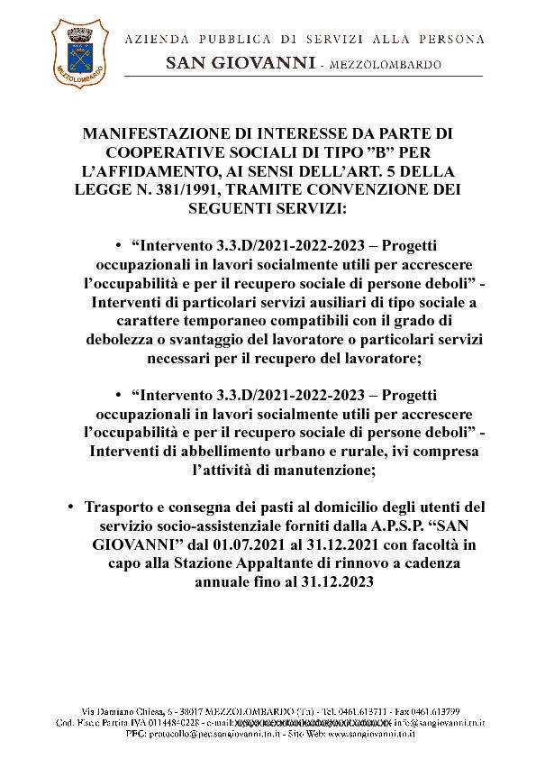Si comunica che nella sezione del sito dell'A.P.S.P. "San Giovanni" di Mezzolombardo "Albo informatico/bandi di gara" sono stati pubblicati i documenti relativi alla manifestazione di interesse da parte di cooperative sociali di tipo B per la partecipazione al confronto concorrenziale teso all'individuazione dell'affidatario dei seguenti servizi: